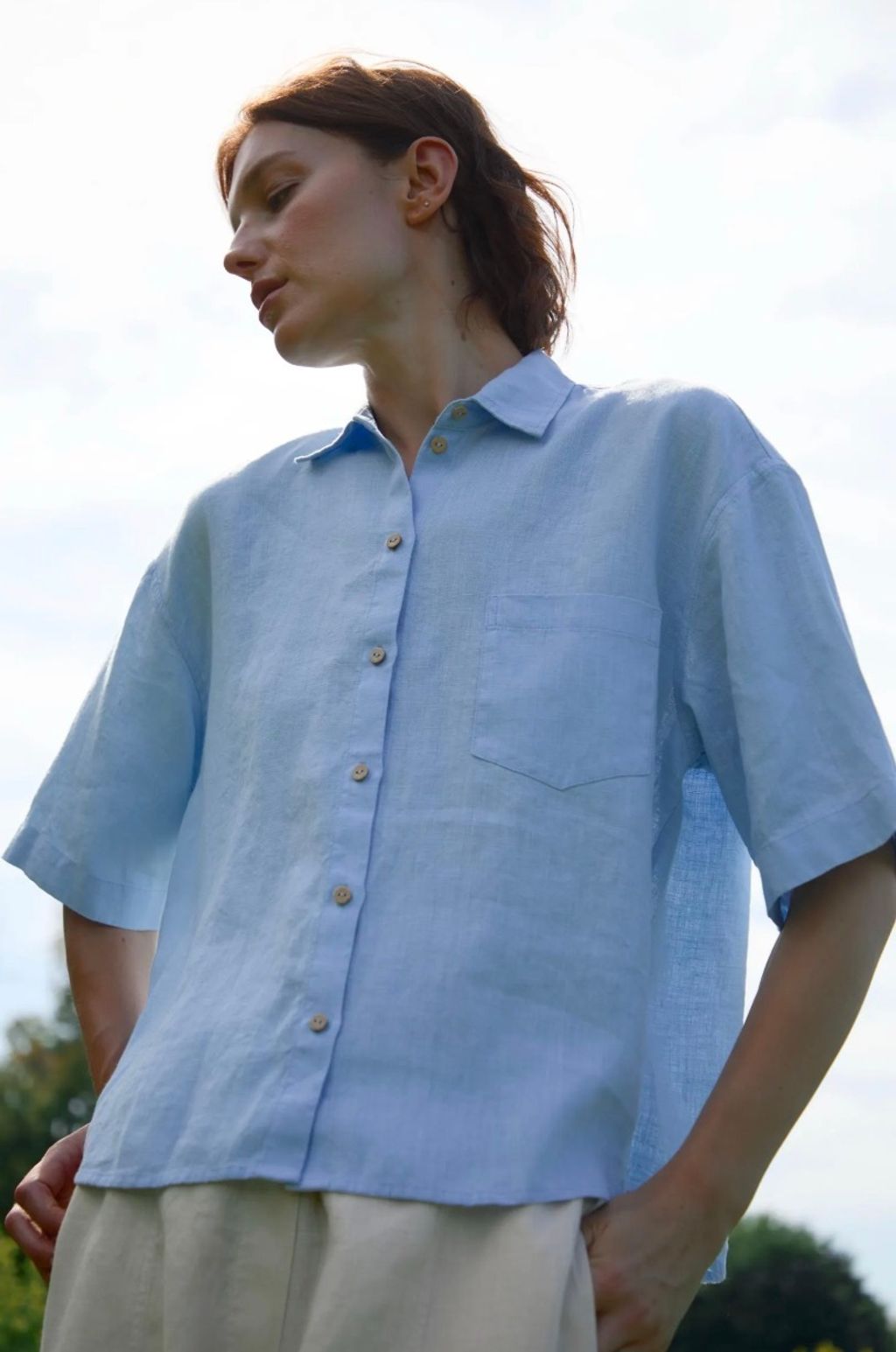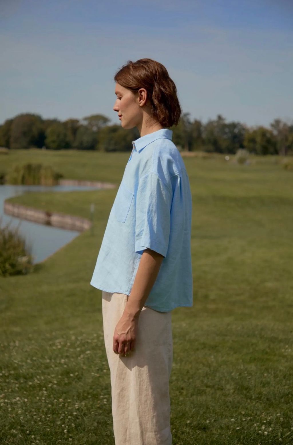 DAISY 亞麻襯衫集輕鬆與魅力於一身,以短版剪裁、落肩設計及寬鬆版型展現隨性風格。前襟鈕扣與俐落的胸袋為整體外觀增添簡潔而精緻的氣息。以柔軟的歐洲亞麻製成,並採用精緻的法式縫線處理,不僅觸感親膚,也確保耐穿性。搭配高腰褲、裙子或短褲皆相得益彰,DAISY 是日常穿搭中的百搭單品。