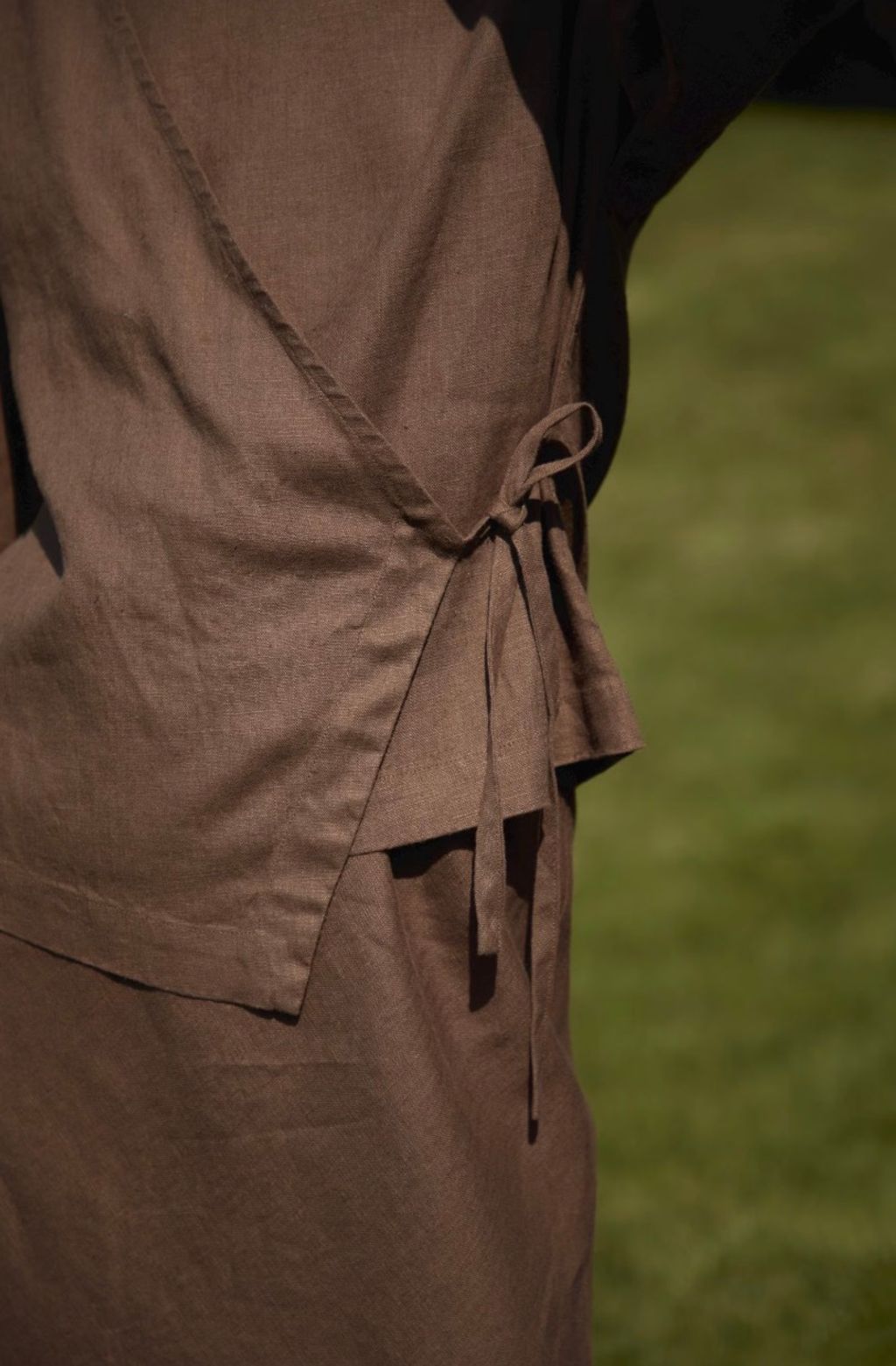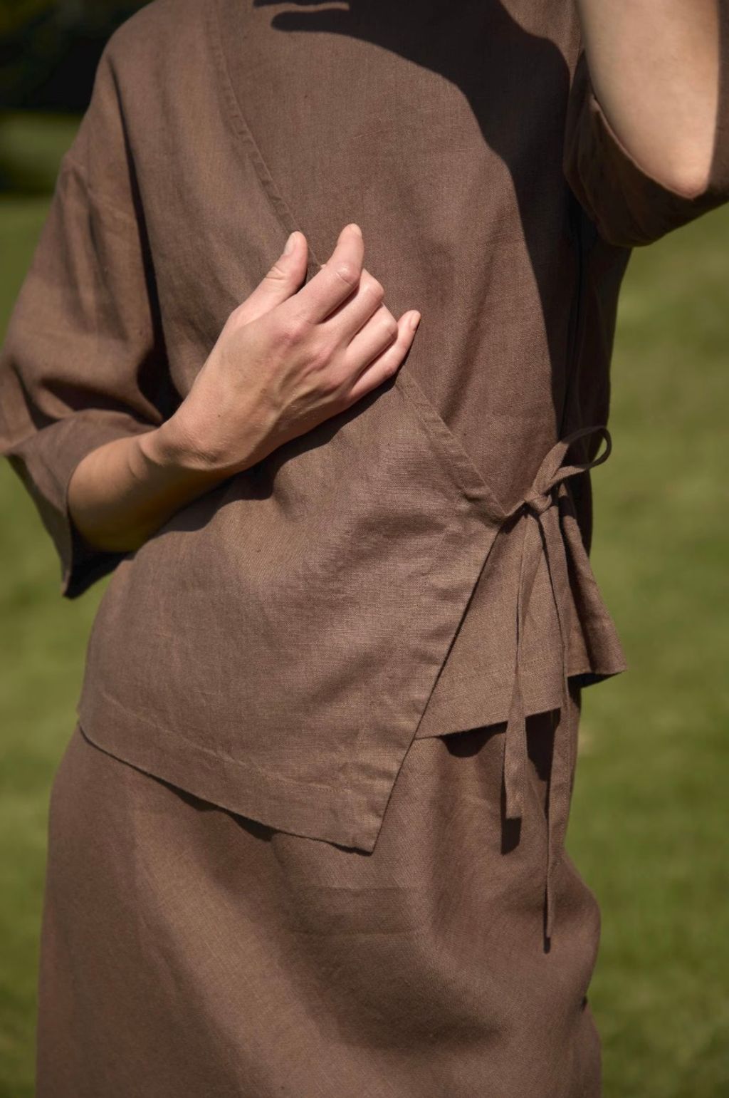 照片中模特身穿的是日式綁帶浴衣上衣,材質選用 Mustang 款中等重量 180g 的亞麻布料,質感與舒適度令人讚嘆。