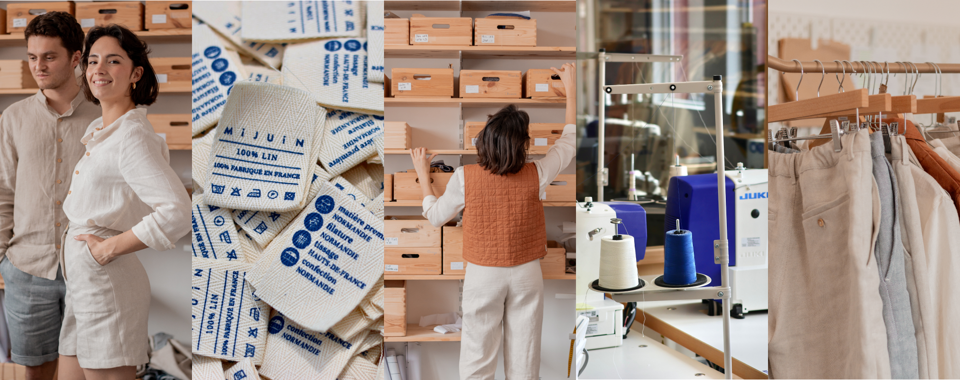我們致力於打造100%法國本土供應鏈,每件Mijuin產品均在諾曼底的自有工廠,由我們的裁縫團隊手工製作。亞麻材料以及即將推出的麻纖維產品,全程使用原產於諾曼底的原料,涵蓋從種植、採摘到紡紗織布的全部工藝,完全在法國境內完成。同時,我們與法國首批恢復本土紡紗工藝的工廠之一建構合作關係,以進一步支持本地產業。