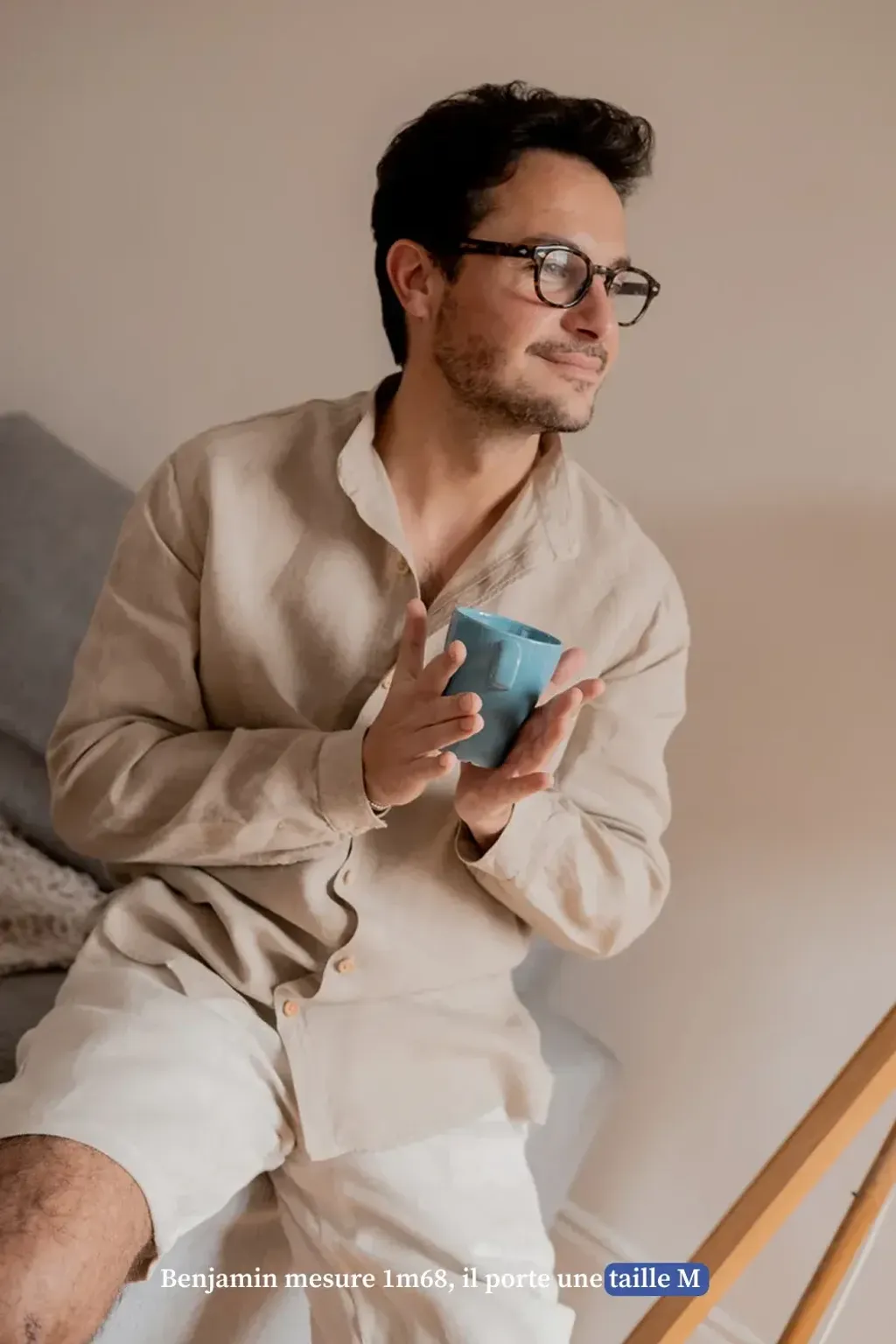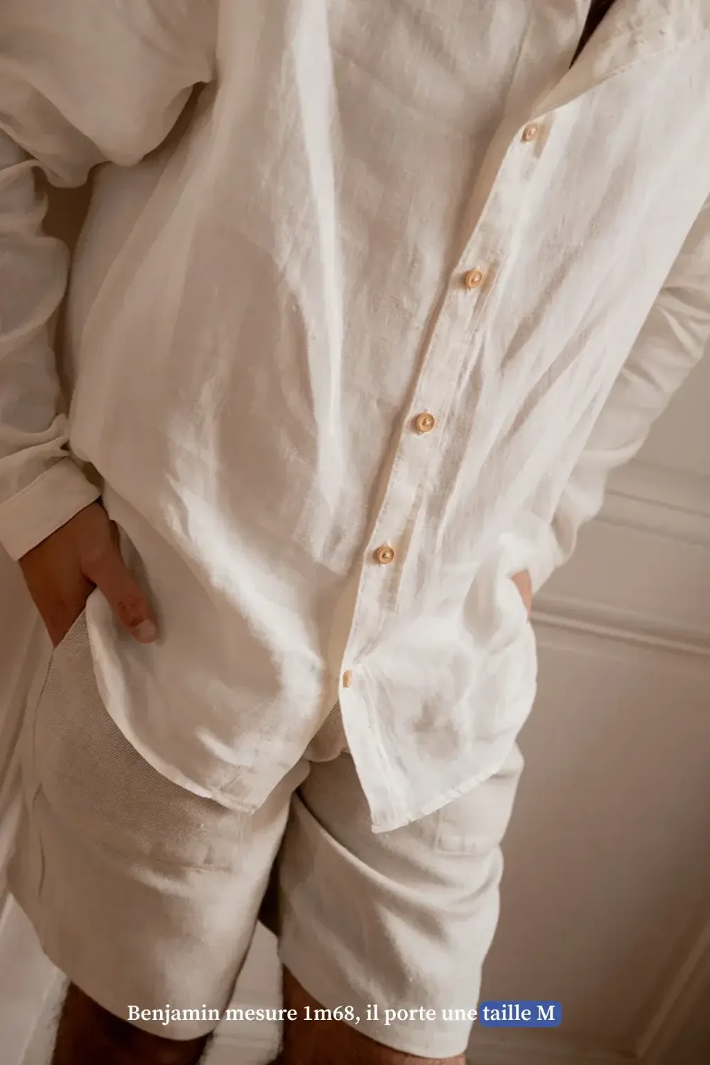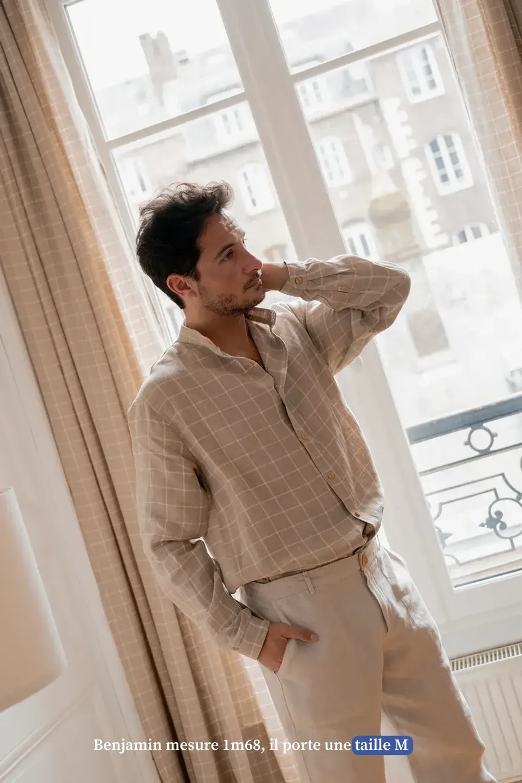 米色和格紋襯衫採用輕薄的150克/平方米布料,而白色襯衫則選用170克/平方米的面料,既能保持舒適輕盈的質感,又有效降低了透視感。這款高品質亞麻布料是與位於諾曼第的「濕紡」亞麻紡紗廠攜手打造的。亞麻纖維經過濕紡處理後,形成了細密的紗線,為布料帶來獨特的柔韌性與質感。